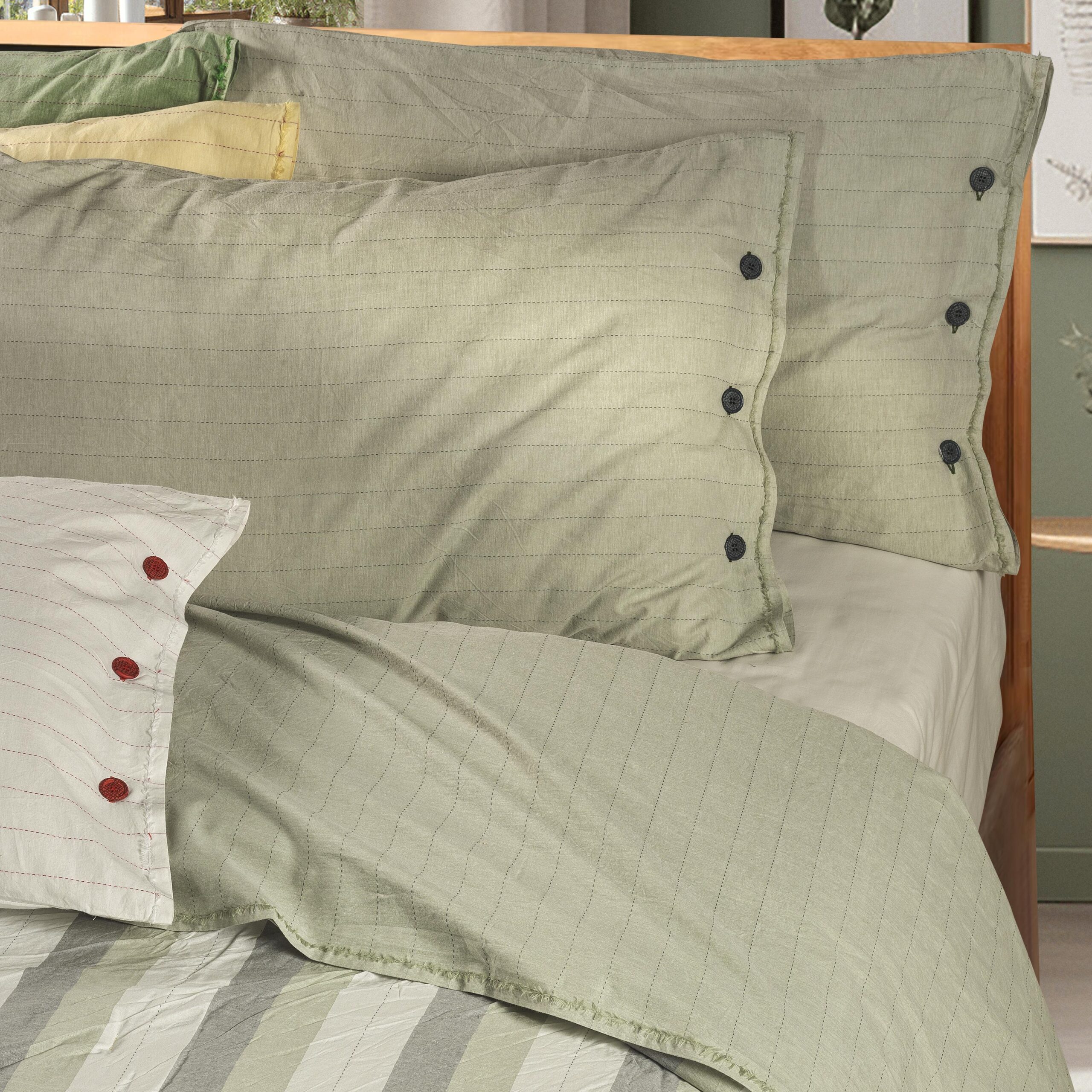 Completo lenzuola matrimoniale in cotone 100% no stiro tinto in filo, dall’effetto naturale e leggermente vissuto che gli conferisce un ottimo aspetto, anche senza l’uso del ferro da stiro.